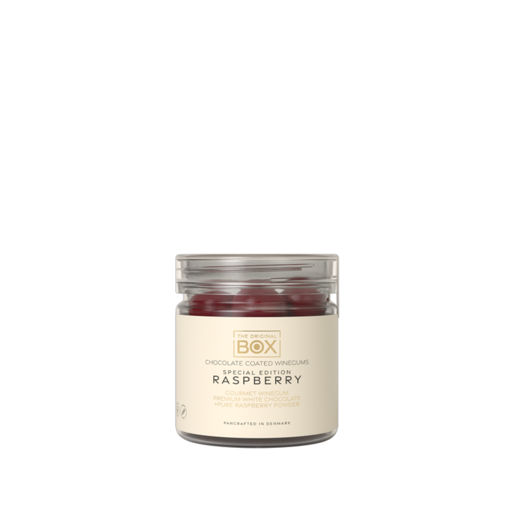 Gelatinefri og 100 % vegansk hindbær-vingummi fra Box The Original, overtrukket med bæredygtig premium hvid chokolade og nænsomt rullet i 100 % naturligt hindbærpulver. En luksuriøs og harmonisk smagsoplevelse, hvor frugtig friskhed møder cremet chokolade og intens bærsmag.