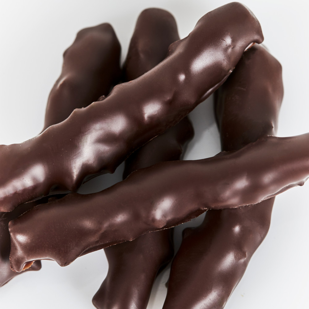 Summerbird kandiseret skal af solmodne økologiske appelsiner fra Spanien, overtrukket med et tykt lag mørk chokolade Arriba Nacional 68 % og knust karamel.