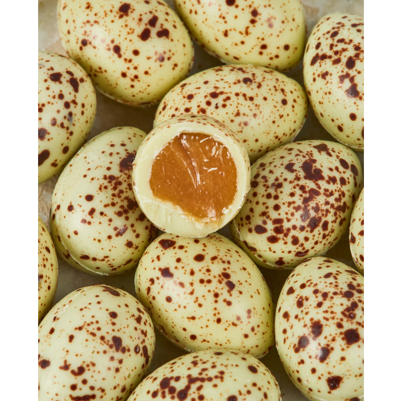 Lemon & Pistachio Quail Eggs fra Summerbird består af en pistacie- og citron-ganache coated i hvid chokolade. Et påskeæg, der er rigt på stor smag, tekstur og balance.