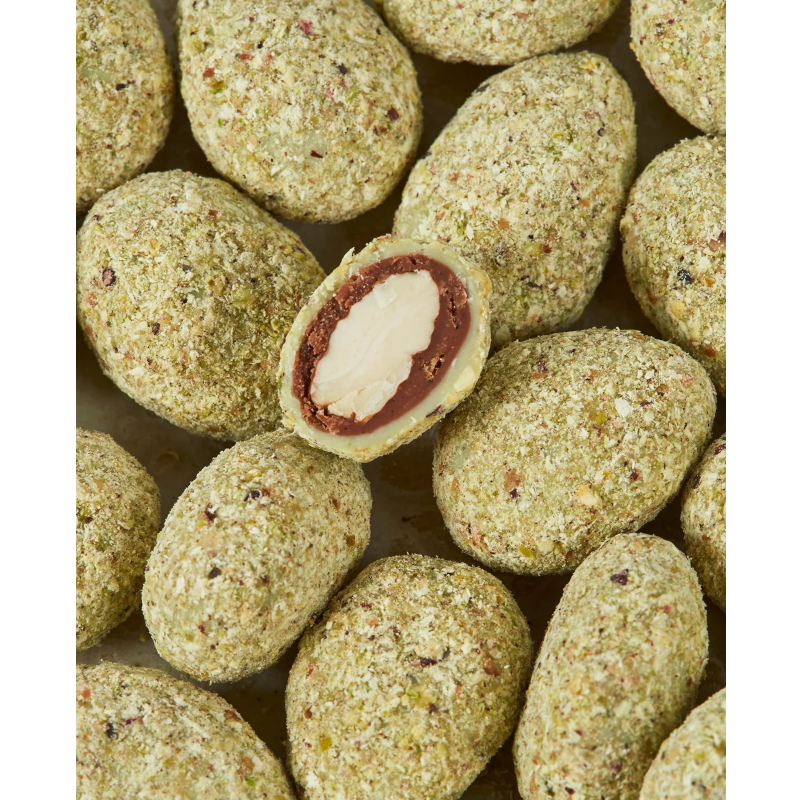 Letristede spanske mandler, drageret med et tyndt lag praliné, mørk chokolade Amazonas 61 %, hvid chokolade og afslutningsvist vendt i revet pistacie. En helstøbt, perfekt og original mandel med en forfriskende smag af forår.