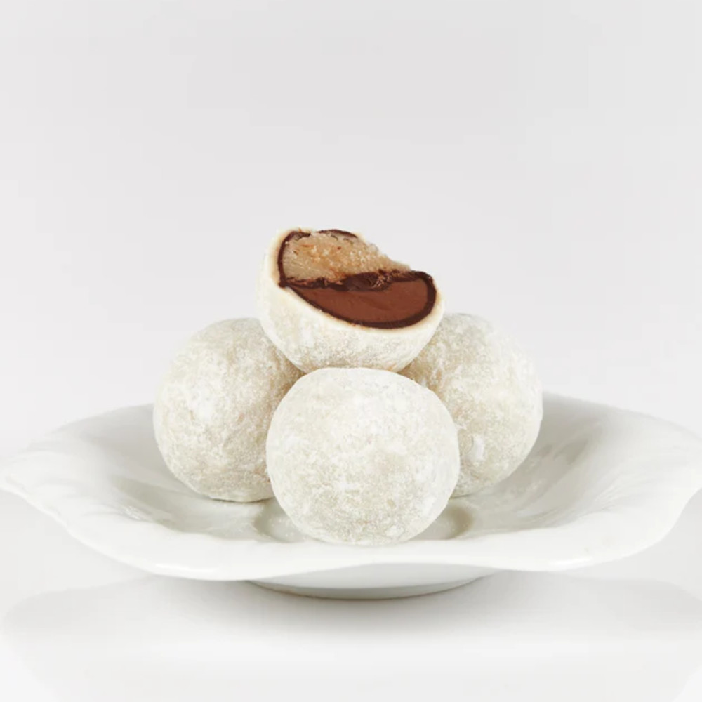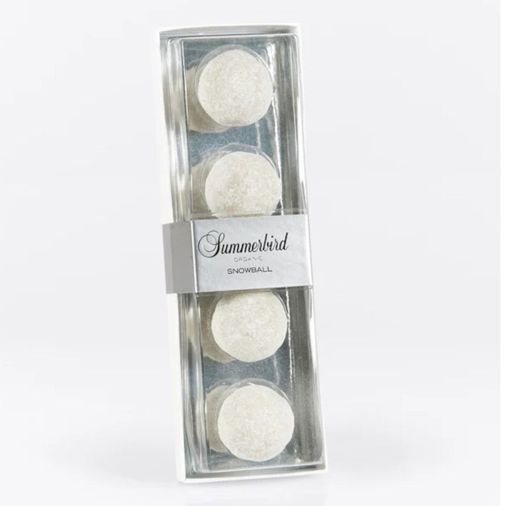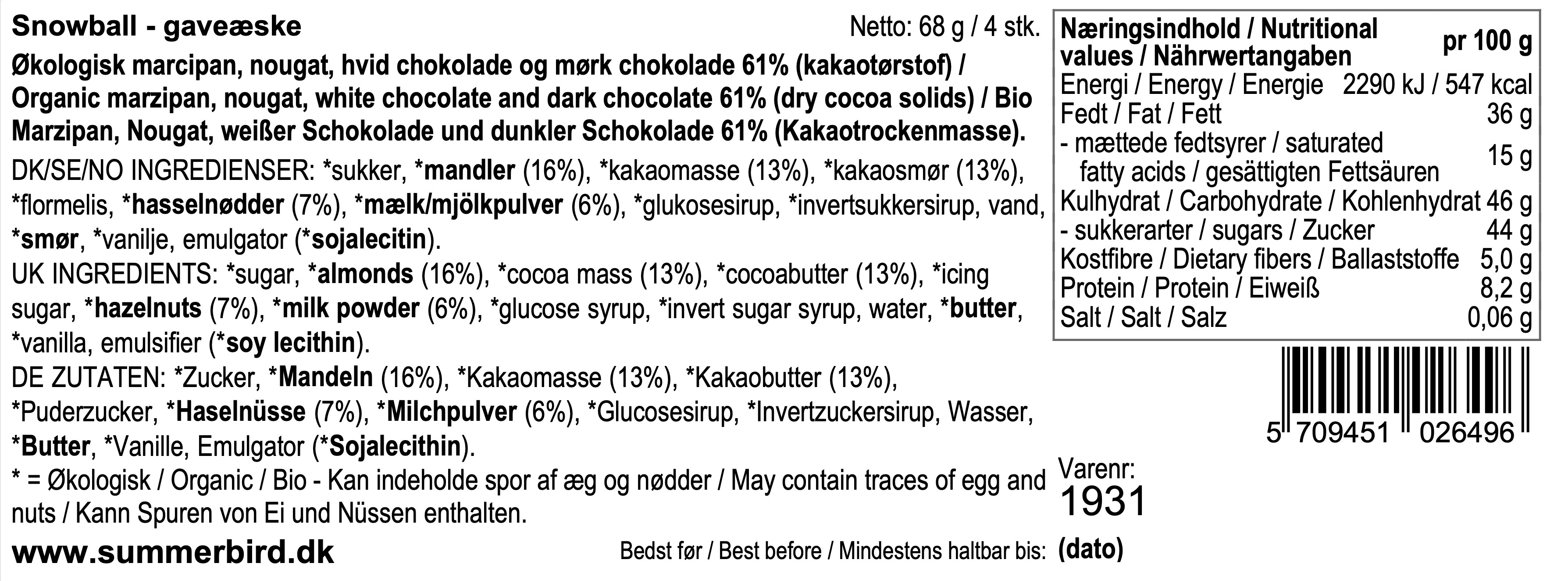Summerbird Snowballs forener blød nougat og fin marcipan, omsluttet af 61 % mørk chokolade og et elegant lag af hvid vanilje. Til sidst afrundes de med et let drys af sne-hvidt flormelis, som giver den perfekte vinterlige finish.