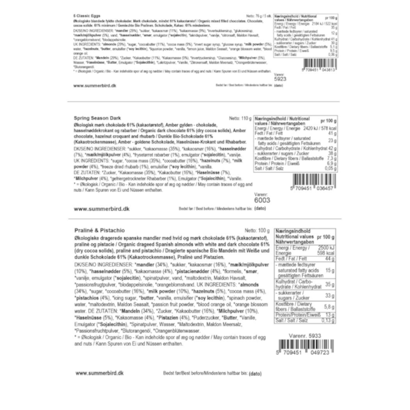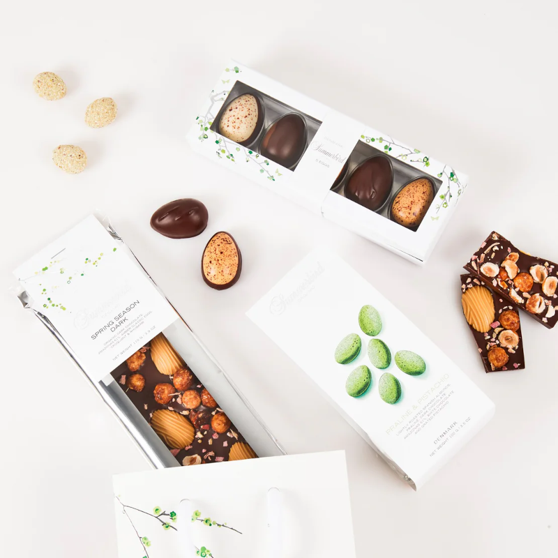 Den smukke gavepose indeholder 3 af Summerbirds mest succesfulde påskevarianter: Praliné & Pistacio-mandler, Spring Season dark-bar og deres 5 Classic Eggs.