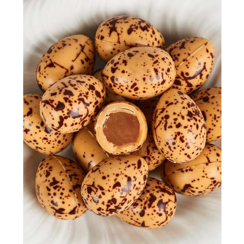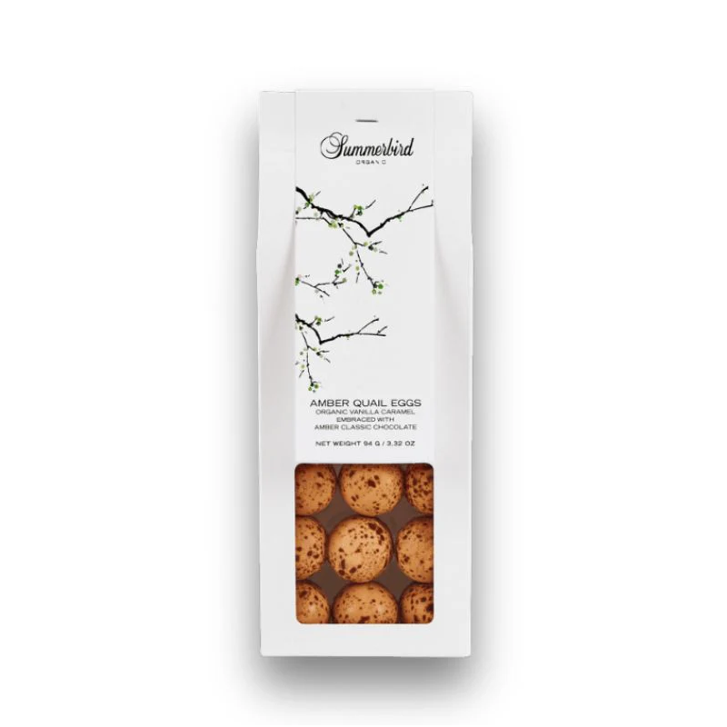 Amber Quail Eggs fra Summerbird består af en karamel- og vanilje-ganache coated i Summerbirds kendte Amber Chokolade. Et påskeæg, der er rigt på stor smag, tekstur og balance.