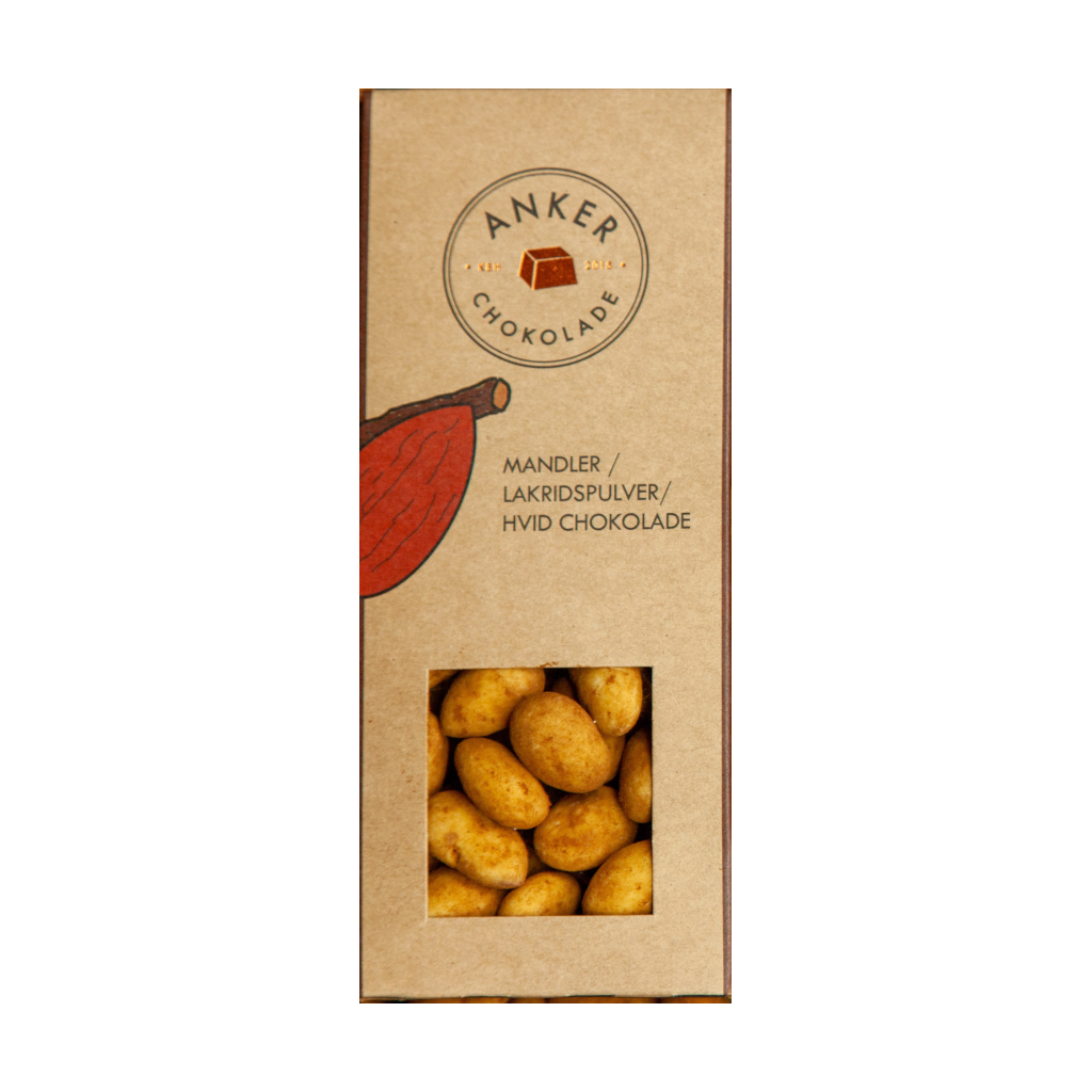 Sprøde Valencia-mandler overtrukket med cremet hvid chokolade og fint lakridspulver. Den søde og runde chokolade balanceres af lakridsens karakteristiske dybde, hvilket giver en harmonisk og elegant dragée. Smagene er udviklet med inspiration fra det gastronomiske køkken og fremstillet med Anker Chokolades fokus på håndværk og kvalitet.