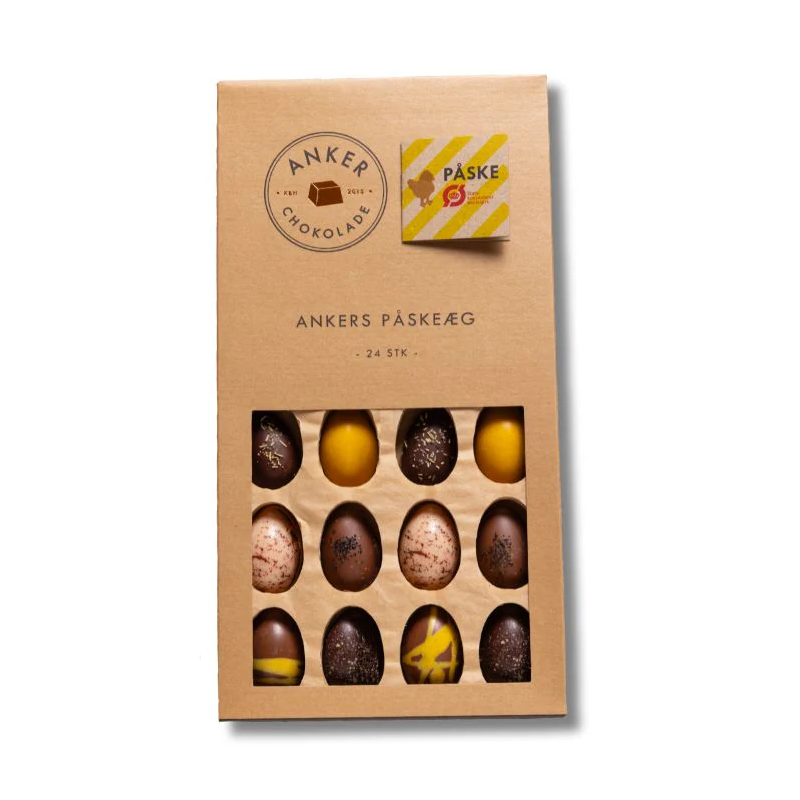 Gaveæske med 6 forskellige slags fyldte chokolade påskeæg fra Anker Chokolade. Der er 4 af hver smagsvariant i æsken, rigeligt til at dele. Denne æske er et godt valg, når du ønsker et bredt og spændende udvalg af chokoladeæg til påsken, men ønsker noget mere utraditionelt.